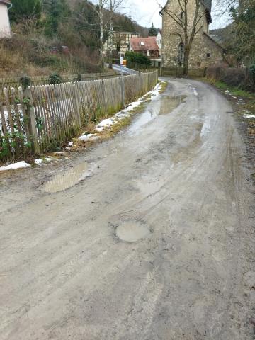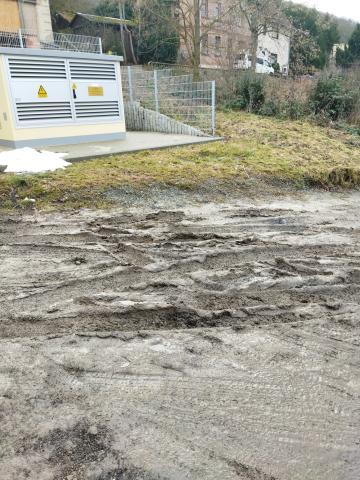 Betrifft die Zuwegung zum Grundstück Lützowstraße 7 und Löschteich Lichtenhain: im vergangenen Jahr wurde der Trafo auf städtischen Grundstück angebunden und eine Kabeltrasse zur Lützowstraße gezogen. Dieser Kabelkanal wurde unzureichend bzw. mit falschen Material verfüllt / verdichtet. Es hebt sich Grund und Boden, große Pfützen stehen auf dem Weg (5 x 2m; bis 25cm tief). Hier muss die bauhausführende Firma (WEA GmbH Erfurt) dringend nachbessern.