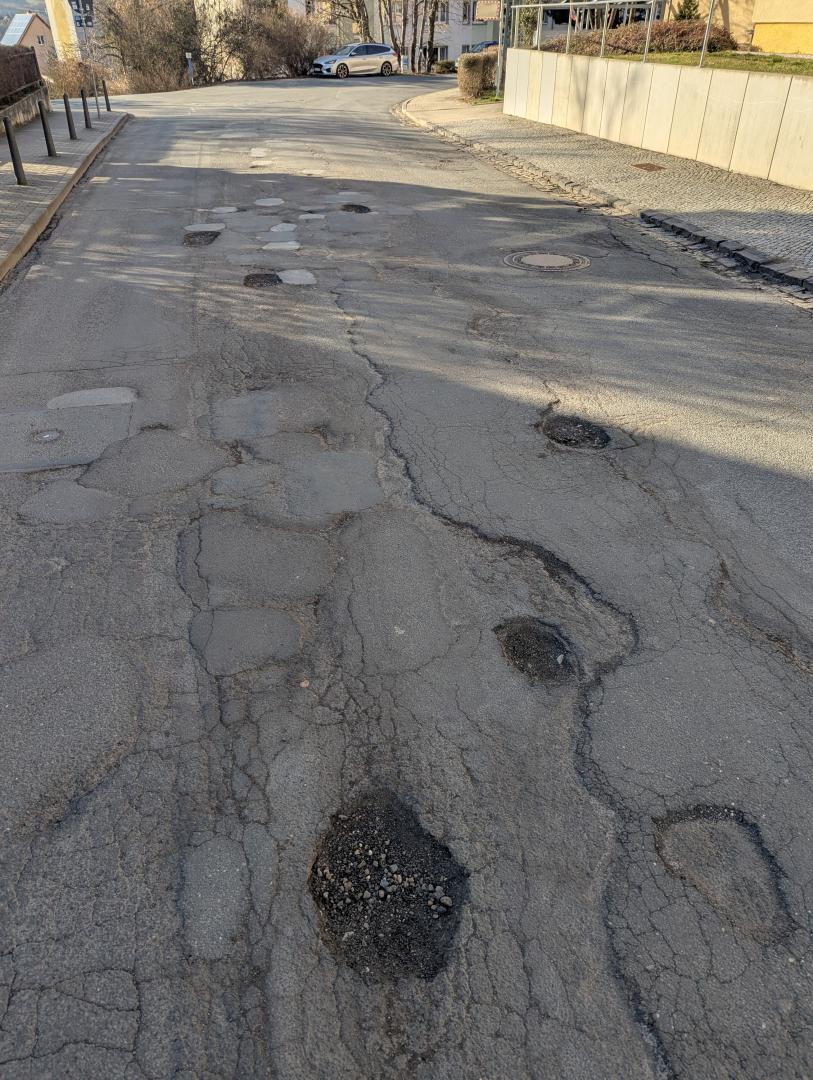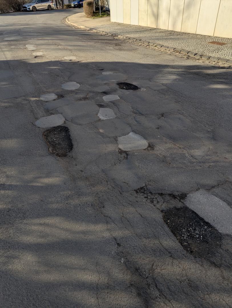 Vielen Dank für die Meldung. Unser Bauhof wurde bereits mit der Reparatur beauftragt. Diese wird allerdings erst passieren, wenn es wieder Heißmischgut gibt.