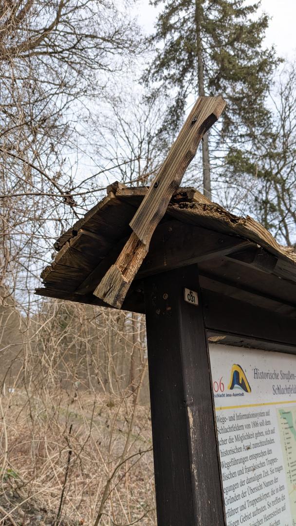 Beschreibung des Mangels Infotafel I031 (1806) Parkplatz links hinter Carl-August Richtung Isserstedt: Holzdach komplett morsch; Bitte reparieren. Bilder des Mangels Details des Mangels Kategorie Stadtwald/Wanderwege Status In Bearbeitung Abteilung Stadtforstverwaltung Geokoordinaten 50.946686252515, 11.532532520714 50.946686252515, 11.532532520714 Anmerkungen / Status Änderungen 29.03.2026 - 12:44 Der Mangel "#20505-2026" wurde gemeldet. 30.03.2026 - 09:18 . 30.03.2026 - 09:18 Der Status des Mangels "#20505-2026" wurde von "Gemeldet" zu "In Bearbeitung" geändert. Kommentare You must have JavaScript enabled to use this form. Ihr Name Betreff Kommentar Hilfe zum Textformat Klartext Keine HTML-Tags erlaubt. Zeilenumbrüche und Absätze werden automatisch erzeugt. Website- und E-Mail-Adressen werden automatisch in Links umgewandelt.