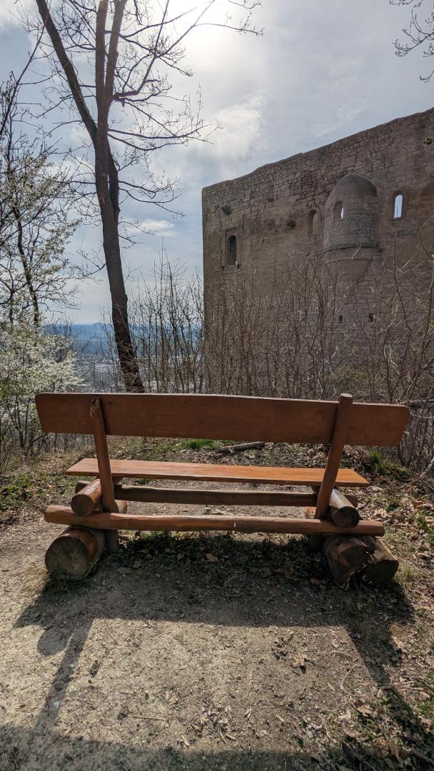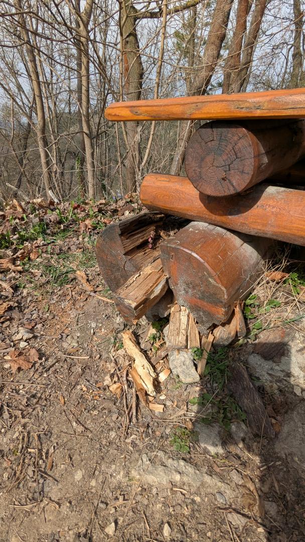 Bank B265? oberhalb Lobdeburg: 1 große Holzrolle morsch, 1 langes dünnes Rundholz abgebrochen, Banknummer fehlt, Bitte reparieren.