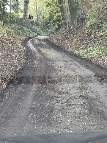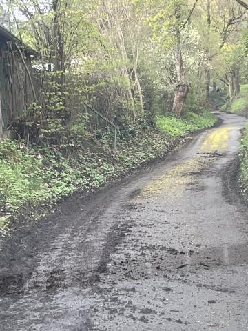 durch die Aufnahme-Position vom Fahrersitz aus und durch die Windschutzscheibe sehen die "Schlammmassen" zumindest auf der rechten Seite einer Asphalt-Decke zum Verwechseln ähnlich. Wieso "Kinder und Erwachsene" dort nicht mehr zu Fuß entlangkommen sollen, oder zum parallel verlaufenden Forstweg kommen, bleibt unklar.