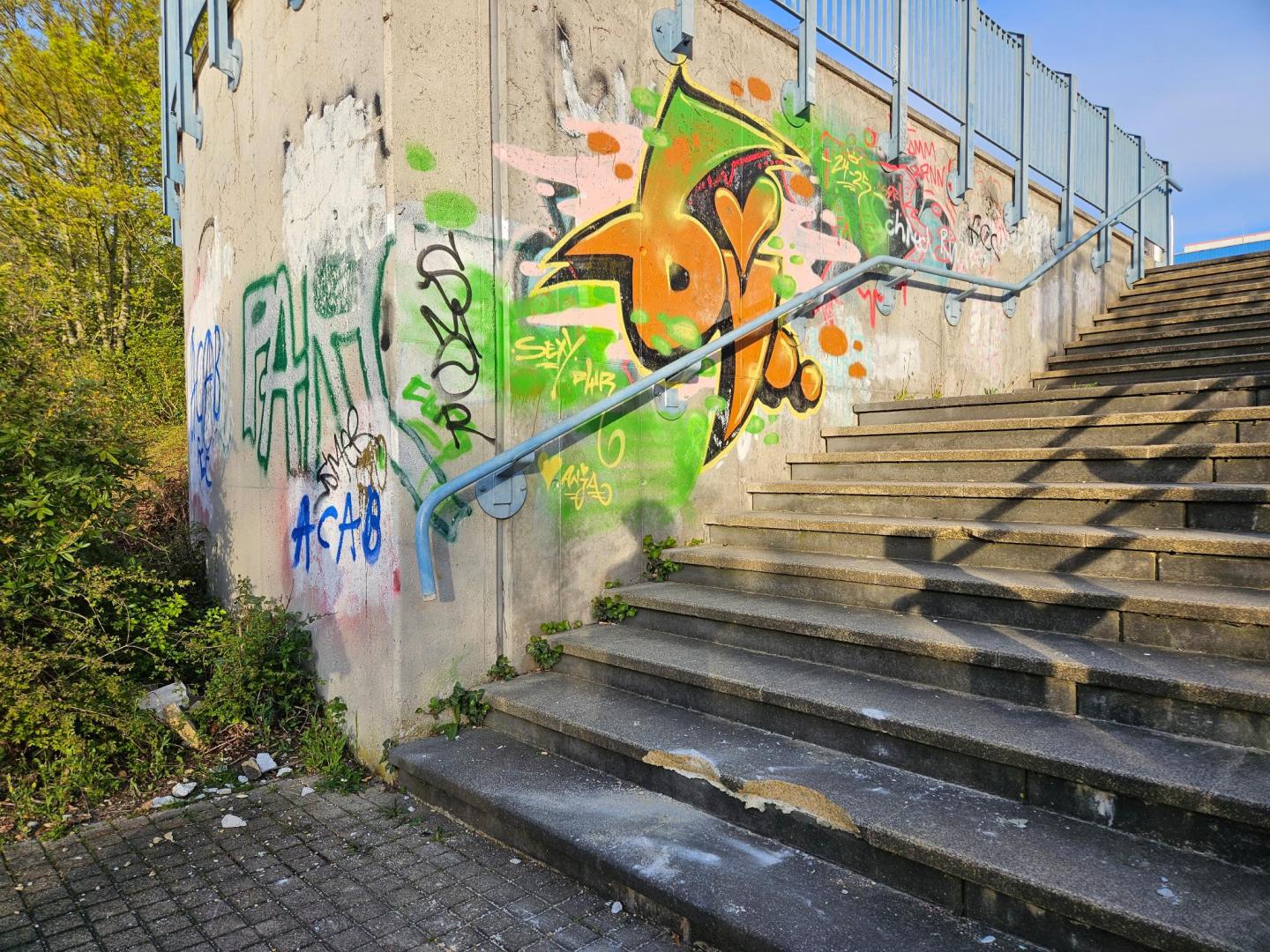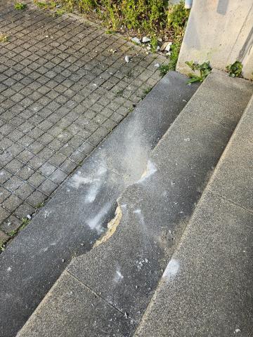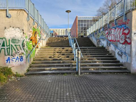 An der Treppe, die zwischen den beiden Sporthallen in Lobeda-West zur Saale führt, sind zu den bereits vorhandenen Ausbrüchen an den Treppenstufen weitere hinzugekommen. Auf der anschließenden Treppe auf die untere Ebene sind weitere (allerdings sämtlich schon ältere) Ausbrüche zu finden. Hier ist sicherlich eine Sanierung angezeigt, um die Verkehrssicherheit zu erhalten.