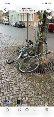 Vielen Dank für Ihren Hinweis. Der Fachdienst Kommunale Ordnung der Stadt Jena entfernt Fahrräder grundsätzlich nur, wenn diese eine Gefahr darstellen, Wege versperren und eine Umsetzung nicht möglich ist oder wenn offensichtlich ist, dass es sich um ein Schrottfahrrad (es fehlen Teile oder weist starke Beschädigungen auf) handelt, an dem das Eigentum bewusst aufgegeben wurde. Es gibt derzeit keinen Grund das Fahrrad zu entfernen.