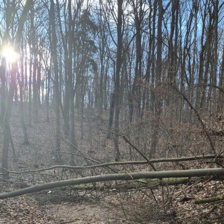 Graffiti Nähe Kleingartenanlage neben dem Forstweg. Vor dem Bismarckdenkmal geht rechts vom Forstweg ein kleiner Weg runter zur Kleingartenanlage. dort sind rechts vom Weg Schmierereien mit blauer Farbe an Baum und Mast, 1 Hakenkreuz und 2 Mal 1161.