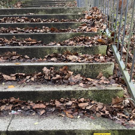 Überall auf der Rabatte liegt Müll und zerbrochenes Glas. Der Gehweg ist zur Hälfte mit altem Laub versperrt. Weiter oben ist der Gehweg komplett verschmutzt. Für Mutti mit Kinderwagen so nicht nutzbar.