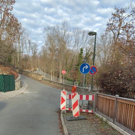 Im markierten Bereich wird zur Zeit der Gehweg geöffnet, weshalb hier Baustellenabsperrungen stehen. Zusätzlich ist ein Schild aufgestellt, dass die Fußgänger auffordert, die Straßenseite zu wechseln. Das ist jedoch schwer machbar bis gefährlich, da auf der gegenüberliegenden Seite kein Gehweg ist. Stattdessen hat man dort auch nur die Wahl zwischen Fahrbahn und Straßengraben, bzw.